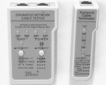 制作出来的双绞线是否能够保证连通,如果只凭观察是不能判断的。一般情况下,还要借助测试工具进行一下测试以确定双绞线能否使用。我们普通使用的测试工具有以下几种。