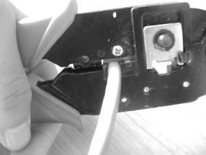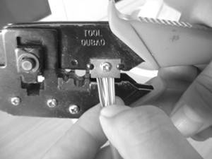 将双绞线一端放到压线钳前端的剥线槽口中,剥线的长度为16mm~20mm,不宜太长或太短。然后轻轻握下压线钳把手(千万别用力压下把手),以刀口略微压在双绞线外壳为最佳(图10),然后压线钳以双绞线为圆心保持刀口压在双绞线外壳的力度旋转半圈,此时便能轻易地剥去双绞线的外壳。
