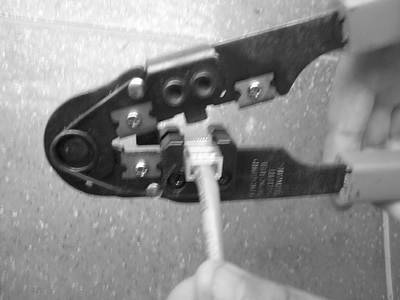 确定双绞线的每根芯线已经正确放置之后,就可以用RJ-45压线钳压接RJ-45接头。将水晶头放入压线钳夹槽中,用力捏几下压线钳,压紧线头即可(图12)。有些比较好(当然也比较贵)的压线钳甚至必须在接脚完全压入后才能松开握柄,取出RJ-45接头,否则接头会卡在夹槽中取不出来。