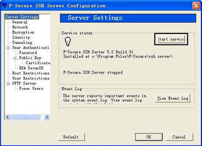 在安装目录下,运行“fsshconf.exe”程序,它虽是SSH服务器的配置程序,但也可以用来启动和停止SSH服务。在弹出的“F-Secure SSH Server Configuration”窗口中,点击左面列表框中的“Server Settings”后,在右边的“Service status”栏中会显示服务器状态按钮,如果服务器是停止状态,则按钮显示为“Start service”(图1),点击该按钮就可启动SSH服务,再次点击可停止SSH服务。