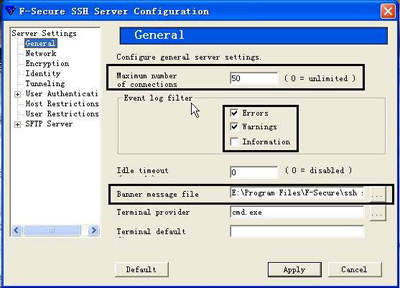 运行“fsshconf.exe”服务配置程序,在弹出的“F-Secure SSH Server Configuration”窗口左栏中,依次选择“Server Settings→General”,然后在右边的“General”框体中就可以对参数进行设置了(图2)。