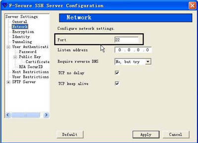 在“F-Secure SSH Server Configuration”窗口左栏中点击“Network”选项(图3),SSH服务器默认使用的是“22”端口,当然也可以自定义端口号(注意,SSH服务器使用的端口号一定不能和服务器上别的程序的端口号冲突)。在“Port”栏中输入想使用的端口号即可,其他的参数设置建议使用默认值。