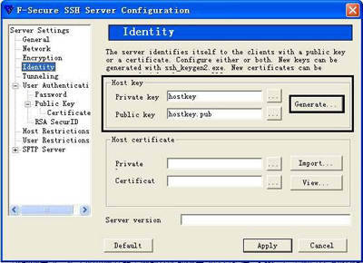 点击“Identity”选项(图4),在右栏中,我们可以使服务器重新产生新的用户加密密钥和对外公开使用的公钥,它们分别存放在安装文件夹的“hostkey”和“hostkey.pub”文件中,点击“Generate”按钮就可以重新生成这两个文件。