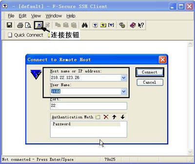 首先,在“Host name or IP address”栏中输入SSH服务器的地址,如输入它的IP地址“218.22.123.26”。其次,在“User Name”栏中输入SSH服务器的管理员账号名,在“Port”栏中输入SSH服务器使用的端口号。最后,点击“Connect”按钮即可连接SSH服务器。