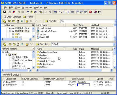 SSH服务器不但提供了远程登录功能,还提供了文件传输功能。点击“F-Secure SSH Client”主窗口的文件传输按钮后,则可弹出文件传输窗口(图6),以进行文件的传输。在“Local Folders”栏中选择一个本地文件,然后将它拖到“Remote Folders”栏中的SSH服务器上用户的主目录中即可,在窗口底部的状态栏中会显示文件的传输状态。