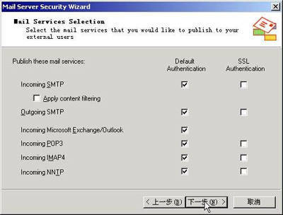 从图4中选择“SMTP”和“POP3”服务,如果你的邮件服务器亦支持IMAP4和NNTP,则请一并选中。