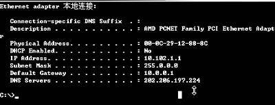 ①查看当前计算机的IP地址设置是否正确,并记录下当前的计算机的IP地址,如果是通过拨号方式连接到Internet上的,请在命令提示窗口中运行ipconfig/ALL命令查看,并记录下IP地址与DNS,如图1所示。