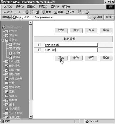 进入之后,单击“系统设置”按钮,从右侧的窗口中单击“域设置”,进入域设置界面后,单击“添加”按钮(图2),在“域名管理”下面的空白文本处输入新建的域名,如msft.com,然后你可以单击“添加”按钮添加其他域名,如etong.net,也可以单击“保存”按钮退出。