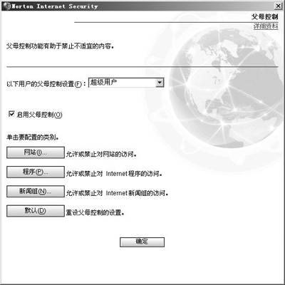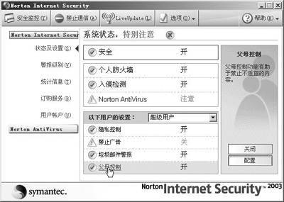 默认状态下该功能处于关闭状态,我们需要手工打开它。在NIS的系统托盘图标上双击鼠标,会打开如图1所示的对话框,单击“父母控制”,再单击右边的“打开”按钮即可启用。