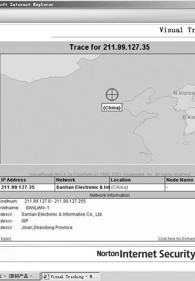 NIS报警时,在其托盘图标上双击,即可查看此次警报的详细信息。在“是否要获得更多信息”中选择“是”,再按“确定”打开“警报助手”对话框(图6),显示在“触发该警报的条件”下方的那个IP地址便是该黑客的IP地址,单击它,稍等一会儿,就会出现一幅地图(图7),地图上会标明黑客所在的国家和城市,不过地图有时也不太准确,我们应该着重注意地图下方显示的信息。对于国内的IP,一般只能查到黑客的ISP和居住城市,而对国外IP,可显示的信息会更详细,有时甚至还能查到该黑客的E-mail、门牌号码等信息。呵呵,够神奇吧!
