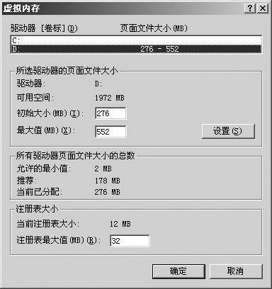 4.在虚拟内存窗口中,在驱动器区域中选择虚拟内存存放的分区(建议放在非操作系统分区),在“初始大小”中设置最小值(一般建议设为物理内存的1.5倍),比如256MB内存的就是384MB,在“最大值”中设置最大值(一般最大值是最小值的2倍),如图2所示。最后,单击三次“确定”按钮,重新启动计算机后设置生效。