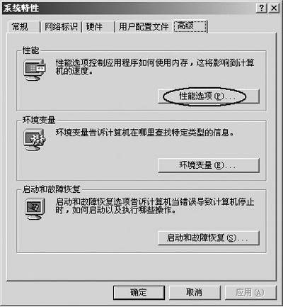 2.在Windows 2000中,按下“Ctrl+Pause”组合键或者通过“控制面板”打开“系统特征”窗口,选择“高级”选项卡,单击“性能选项”按钮(如图1所示)。