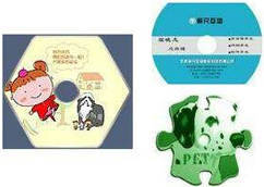 异形光盘是一种另类的产品,形状各不相同(图2),一般直径不大于120mm,不小于77mm 。因为数据必须存放在光盘的连续圆轨迹上,还要保持转动平衡,所以多数异形光盘只能作为装饰品。目前这类CD-R光盘大多用于厂商进行企业形象和产品的宣传。