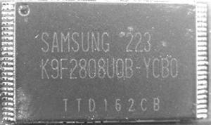 可以看出,这款闪存的存储芯片为三星K9F2808U0B(图2),真实容量为16MB。