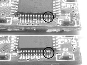 用烙铁将USB控制芯片的这两根针脚短接(或者可以用铁丝连接这两根针脚),便完成了改造的第一步(图3)。