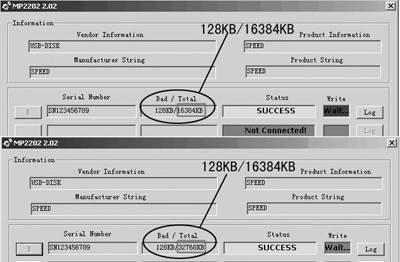 图4是针脚短接前后的信息,请大家注意总容量,在短接针脚并利用工具软件初始化后,总容量已经由16384KB变为32768KB。