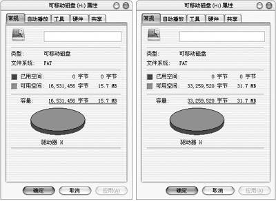 在Windows中查看其属性,容量也已经显示为32MB(图5,左图为修改前的属性)。