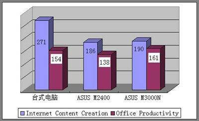 SysMark和MobileMark2002属于同一家公司的测试软件,只不过SysMark将多媒体创作和办公应用分开来测试,这就是Internet Content Creation(Internet内容创作)和Office Productivity(办公室生产力应用)。从测试成绩可以看出,华硕的两台笔记本电脑在多媒体创作性能上远远不如配置AthlonXP2500+的台式电脑,毕竟处理多媒体时经常要向磁盘读写体积巨大的文件,而笔记本电脑的磁盘性能又远远赶不上台式机硬盘,输掉这项测试情有可原。而对笔记本电脑更重要的办公应用上,华硕M2400的得分要比AthlonXP 2500+低上10%,但是512MB内存的M3000N则又高出接近10%。从这可以看出这两台笔记本电脑的办公应用性能已与台式机难分伯仲。