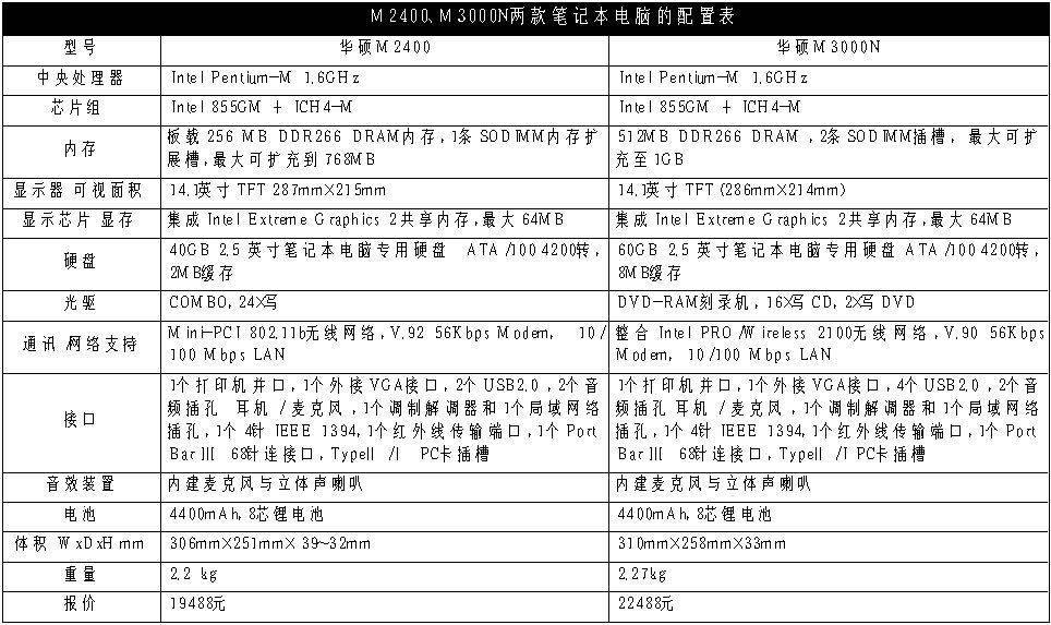 这次评测的两台华硕笔记本电脑──华硕M2400、M3000N,都是目前华硕笔记本电脑的主力机型。华硕M2400属于M2N系列,外形与以前的M2一样,内部从P4-M搭配SiS 650芯片组升级到迅驰平台。M3000N则是今年4月发布的新机型,同样是迅驰架构,属于轻薄的商务机型。两台笔记本电脑的配置见表格。
