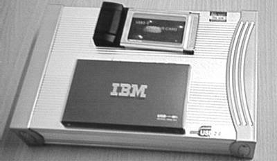 看来,我们需要直接购买USB2.0外置刻录机、USB2.0的外置硬盘盒,由于笔者的笔记本电脑不直接支持USB2.0,必须使用USB2.0的PCMICA卡。而且,外置刻录机显得太贵了。能不能有更廉价的解决方案呢?答案是:有。自己组装一个外置刻录机吧,需要三大件,如图1所示。大家可清楚地看见,图中的白色铝合金的盒子是自组装的外置刻录机,上面分别是PCMICA卡,外置硬盘盒。在这里刻录机选的是中宝的48倍速内置刻录机,主要是由于价格低,250元,且一年包换。外置光驱盒是深圳产的蓝天使,170元,IBM的外置硬盘盒45元,PCMICA卡,130元,由于移动硬盘已有,不需投入,总投资不足600元,就成功组建了如图2所示的移动存储系统。