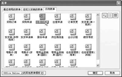 InfoPath提供了企事业单位常用的23种各类表单,其中“出差日程表”正是小李要填写的表单。他只需运行笔记本电脑中的InfoPath 2003,单击“填写表单”任务窗格“填写表单”下的“其他表单”,即可打开如图1所示的“示例表单”选项卡。