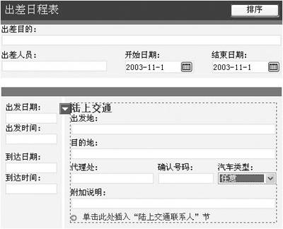 小李在一家网络设备制造企业工作,经常到全国各地进行售后服务。过去为“出差日程表”常跑冤枉路,主管领导不是外出就是在开会,常常因为“出差日程表”审批不及时耽误行程。自从单位购买了Office 2003企业专业版,他再也不用找领导审批出差日程表了。这不,为了到河北邯郸维护电话交换机,小李正在InfoPath中填写“出差日程表”呢。