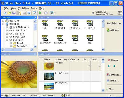 通过文件浏览器我们可以将需要以幻灯方式浏览的图片添加到图片列表栏中。常见的操作方法有两种,一种是在选择所需要的图片后单击文件浏览器旁边的“Add Selected”按钮,另一种则是单击文件浏览器旁边的“Add All”按钮将该文件夹内的所有图片添加到图片列表中。在图片列表中选定一幅图片后,在图片预览窗口中就会显示出该图片的缩略图,单击“Caption”、“Rotation”、“Sound”等下拉菜单可以分别为图片设置文字说明、图片旋转、声音等选项。单击控制栏上的“Remove”、“Move up”、“Move down”等按钮可以对所选的图片进行删除、上移、下移等操作。