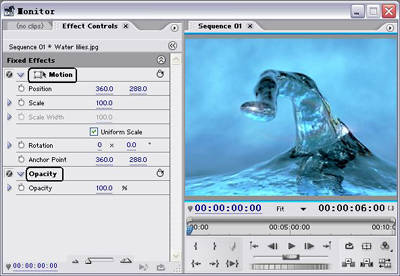 Premiere7.0的运动路径比6.5版本改进了不少。我们将一个视频片段放入时间线上,先选中这段视频,然后单击菜单“Window→Effect Controls”打开视频特效控制窗口,如图2所示。从图2中可以看出,Premiere7.0已将Motion(运动特效)和Opacity(透明度)内置其中了。Motion特效包含了Position(位置)、Scale(比例)和Rotation(旋转)特效等,使用起来非常方便。Opacity特效也使改变视频的透明度变得非常方便,只需拖动Opacity旁边的滚动条即可。