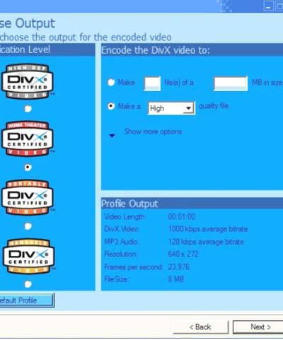 启动Dr.DivX,出现一个选择操作类型窗口,点击VIDEO FILE按钮,此时出现一个文件打开窗口,选中要转换的文件名,经过几秒后,程序自动列出片源分析后的信息。点Next到下一步,这儿可以选用程序内置的几种编码方式,选择Home Theater(家庭影院)配置项,在窗口右下方的Profile Output项出现了输出文件的一些参数,如DivX Video(编码的平均码率),Resolution (分辨率,此值是读取片源的文件大小),FileSize(生成的文件大小)等(如图)。