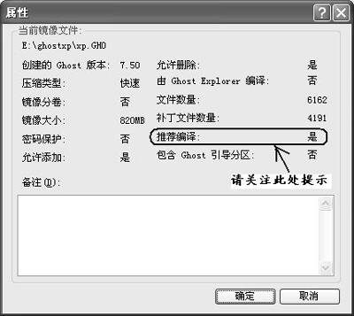 用Ghost浏览器打开XP.GHO,选择“文件→属性”,打开“属性”对话框(见图),“推荐编译”项后面的值果然为“是”,这说明该映像文件确实需要重新编译。选择“文件→编译”命令,为编译后的映像文件输入新的文件名(比如XP1.GHO),按“确定”后就会显示“正在编译分区”的提示信息,同时显示已经编译的百分比。用新生成的XP1.GHO再次进行系统还原,速度恢复到了以前的水平,问题得到了圆满解决。