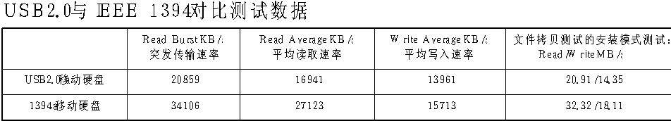虽然USB2.0可以提供480Mbps,略高于IEEE 1394a提供的400Mbps,那么是否意味着USB2.0更具优势呢?答案是否定的。在一般情况下,USB2.0的实际传输速度只有USB1.1的2~13倍,远远达不到其理论值,而且如果几台设备共用一个USB通道,主控制芯片会对每台设备可以支配的带宽进行分配、控制,这时的传输速度就更低了。而目前主流的IEEE 1394a则很少存在这种情况。从相关的对比测试来看(见表),IEEE 1394a在突发传输率、平均读速率/写速率、工作站性能、文件拷贝速率等方面都要远优于USB2.0,可以想象IEEE 1394b的优势将更为明显。不过,IEEE 1394有一个缺点,就是IEEE 1394总线需要占用大量的资源,因此要让其达到最佳传输速率需要高速CPU来配合。