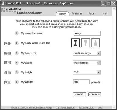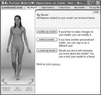 登录网站http://www.landsend.com,在页面的左上方点击“My model”按钮进入虚拟形象设置页面,如果你是男性就点击“Try model for Men”,这里我们以MM们为例,点击“Try model for Women”,在弹出的页面中点击“Create a model”来设计你的虚拟形象。