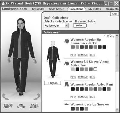 在图3中点击“Collections”进入试衣间,首先在“Outfit Collections”栏中选择服装种类,包括运动装(Activewear)、休闲装(Casual)和工作装(Wear to Work),然后在各种类型中找到你喜欢的服装,点击服装或“try on”按钮即可试穿,你还可以分别为你的上衣、内衣、裤子和鞋子进行配色,并且在左边的显示框中能实时看到修改效果(图3)。