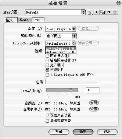 然后将先前创建的MC拖入场景中调整位置,并在上方加入“音乐万年历”的字样,接着发布出来看一看效果。在发布时大家要注意一下,发布时的设置要改为如图4所示,因为这个组件在某些版本的播放器中可能会出错误,所以得将发布时的播放器版本选为6,将AS版本选为AS 1.0。