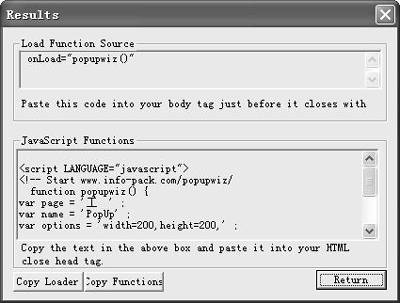 点击主界面中的“Create Popup”,进入“Results”界面(如图),使用其上的“Copy Functions”按钮把“JavaScript Function”代码复制到剪贴板上,并粘贴至目标网页HTML代码的<HEAD>与</HEAD>之间。同样使用“Copy Loader”按钮复制“Load Function Source”代码,并粘贴至HTML代码的<body>中,如<body onUnload="popupwiz()">。这样我们再把编辑好的网页传到服务器中,以后每次打开该网页时就会弹出一个窗口了。