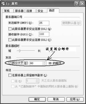 打开OE(笔者使用的版本是6.0版),在邮件收发窗口中,单击“工具→账户”,在“Internet账户”对话框中选择想要设置自动拆分附件的账户,然后点击右侧的“属性”按钮打开“属性”对话框。在该对话框中选择“高级”选项卡,勾选“拆分大于KB的邮件”(见图)这一项,并设置好拆分的最小单位(例如60KB,我们也可根据自己的需要进行设置)。