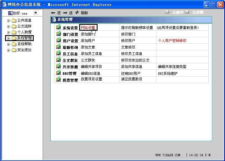 在网络办公系统主窗口左栏中,点击“系统管理”(图2),然后在右栏的系统管理列表框中点击“网站设置”选项,进入网站设置窗口。在该窗口中,可对办公平台的一些基本参数进行设置。