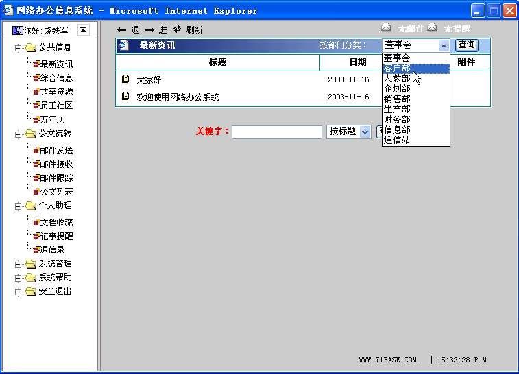 用户登录到网络办公平台系统后,主窗口会自动切换到“公共信息→最新资讯”选项(图3),在“最新资讯”窗口中用户可以随时了解到单位发布的资讯、计划、规章制度,以此来合理安排自己的工作。当然用户也可以查询某个部门发布的最新资讯,在“按部门分类”下拉列表框中选择你想查询的部门,如“客户部”,点击“查询”按钮,就会列出该部门发布的资讯了。另外,还可以使用“关键字”进行搜索查询。
