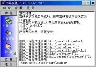木马克星的安装与使用相当简单,你只要将软件下载下来,并执行传统的安装过程就可以了。该软件在启动后首先会扫描内存,并直观地显示当前内存中有没有木马(如图)。假如你想清除硬盘上的木马,则可以选择“扫描硬盘”功能;同时你还可以选择是否在Windows启动的时候自动启动,是否使用木马防火墙(该防火墙主要针对蠕虫和端口进行监视)等。