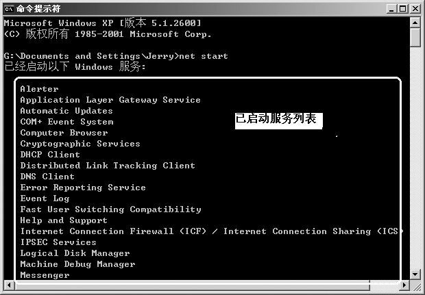 以Win XP为例,首先你要使用系统管理员账户或以拥有Administrator权限的用户身份登录,然后在“运行”中输入“cmd.exe”打开命令行窗口,再输入“net start”回车后,就会显示出系统正在运行的服务(图1)。