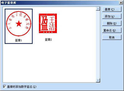 在电子签章库窗口中,选择需要添加的电子签章,然后单击“盖章”按钮即可。如果电子签章库中没有签章,可以单击“新建”按钮,新增一个签章。需要注意的是,电子签章的格式必须为“JPG”、“JPEG”、“BMP”、“PNG”等格式。