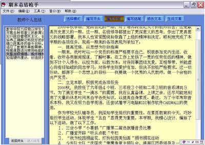 教师之友是一款针对中小学教师的教学工作总结而设计的软件,具有拟订开学工作计划、编写教案、期末工作总结等功能。它的期末工作总结功能可以根据不同的模式,自由地选择句段,自动地生成总结,对于广大中小学教师来说,是个不错的助手(图4)。