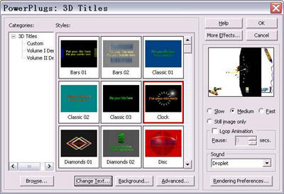 安装PowerPlugs后,在PowerPoint的工具栏中会出现一个PowerPlugs工具栏;单击工具栏上的“Insert 3D Title Slide”按钮,然后在弹出的“PowerPlugs:3D Title”窗口(图7)中即可设置3D切换特效;单击“View Show With 3D”按钮,就可以看到刚才所设置的3D效果。