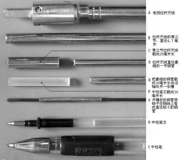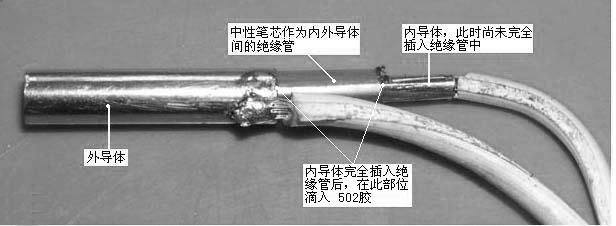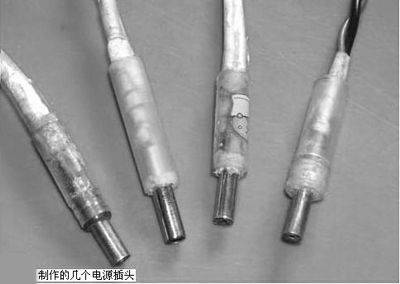 笔者花两元钱买了一根电视机用拉杆天线,制作了几个插头,使用效果良好。拉杆天线由几节直径不同的簿皮铜管组成,第三节的外径为4.7毫米,正好适用。用锯条截成25毫米长,可作为插头的外导体。插头内导体的外径约1.8毫米,拉杆天线最细的铜管,其外径为2.75毫米,不能直接利用。用锯条截成25毫米长的一段夹在钳子上,再用锯条沿铜管的轴向锯开一条口,用一根直径约1.4毫米的铜线插入开口的铜管中,用钳子把铜管贴着铜线夹紧使其卷成直径约2毫米的铜管。内外导体之间的绝缘使用塑料中性笔的笔芯,直径为4.15毫米,截成30毫米长放在内外导体之间,如感觉松动,可在其间插一点细竹条,然后在内外导体上焊接出引线,用502胶从引线处滴上数滴使内外导体和绝缘管都固定起来,外面包上透明胶带再套上一段长约30毫米的塑料中性笔杆就做成了。注意:把插头的导线连接到电池时,千万不要把正负导线的极性接反了,接错了可是要烧毁数码相机的!C-730相机的外接电源插口,内面导体是正极,外面导体是负极,在相机上有标记。导线焊接到电池上时,最好串联一个2安的保险管,以防万一有短路时不致把电池弄坏。制作的情况请参看图1~图3,图4是制作完成后的照片。
