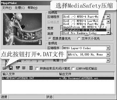 Step2:打开《豪杰超级解霸》工具集中的《MPEG转AVI》软件,并选择“文件”菜单下的“打开”命令,选择VCD光盘MPEGAV目录下的*.dat文件,或DVD盘VIDEO_TS目录下的*.vob文件。打开文件后,点击窗口中的“视频流压缩程序”下拉列表,选择MediaSafety压缩程序。音频流压缩程序选择MPEG Layer-3 Codec(MP3)即可,其他设置如果你不熟悉,选择默认即可(图3)。