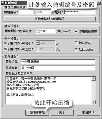 Step3:选择“处理”菜单下的“开始压缩”命令,会弹出“安全多媒体”剪辑信息配置对话框,输入你申请的“剪辑编号”和此编号附带的管理密码。下面的“播放设置”是制作安全多媒体文件的关键所在(图4),具体配置如下: