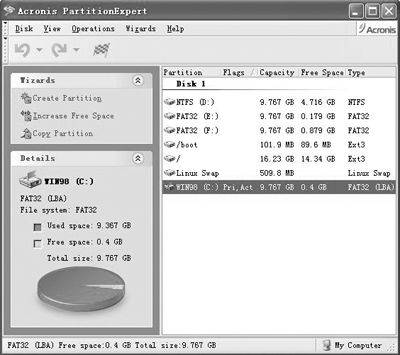 前些时候换了硬盘,由于分区不够合理,使用一段时间后,非Linux分区空间告急,看来需要向Linux分区要点空间了。鉴于笔者的硬盘上的分区类型太多,笔者找到了一款号称完全支持众多分区格式的无损分区软件──Acronis PartitionExpert,决定用它来试一下。