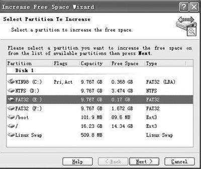 我们的目的是增加分区的空间,所以先选择左边“Wizards”中的第二个选项“Increase Free Space”(增加剩余空间),点击它后会进入增加空间向导(图2)。