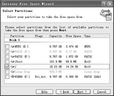 这里要选择的是从哪几个分区中腾出空间来,你只要选中分区前面的复选框即可。在这里大家应该注意到,Linux Swap分区是灰色不可选的。