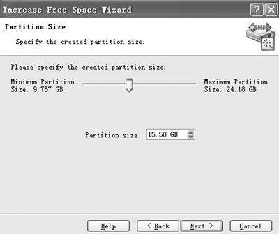 点击“Next”后,软件会扫描硬盘,计算出扩容后E分区容量的最大值和最小值,在图4中就可以根据需要调整E分区的大小了。